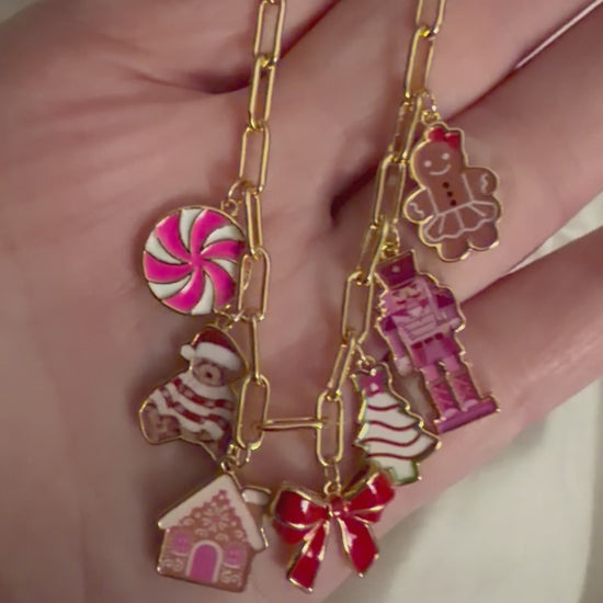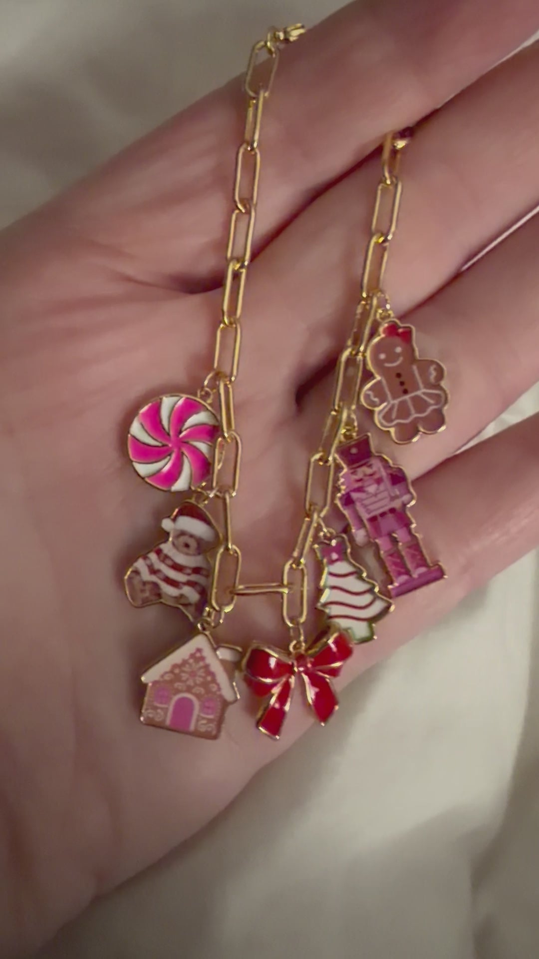 Adorable and festive, perfect for everyday wear during the whole Christmas season. Adorned with seven charms in dainty pinks and reds. This makes a great gift for a young lady, teen or even Grandma because it’s adjustable!