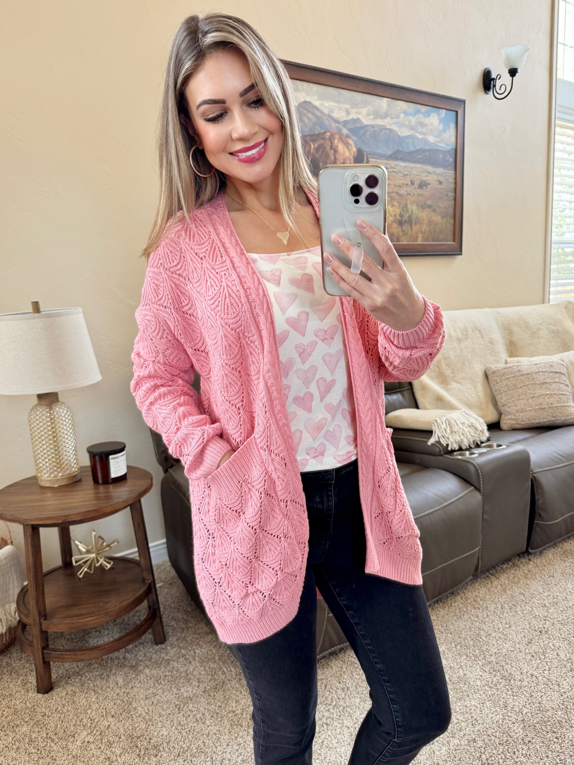 Cozy up in style with our Open Knit Cardigan. Made with an open knit design and featuring two convenient pockets, this cardigan is perfect for those chilly days. Stay warm and fashionable with this must-have addition to your wardrobe!